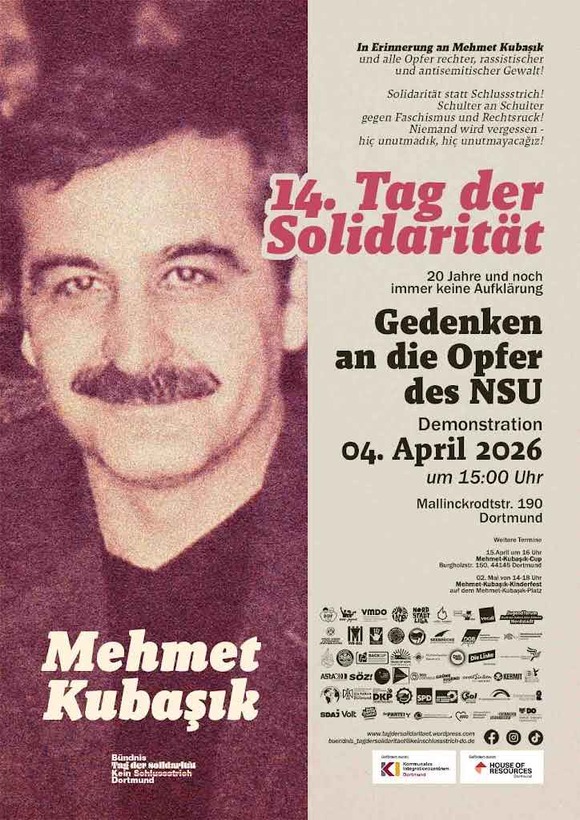 Am Samstag, 4. April 2026, gibt es um 15 Uhr ein Gedenken an Mehmet Kubaşık am Tatort in der Malinckrodtstraße 190 in Dortmund. Am Montag, 6. April 2026, gibt es in Kassel ein Gedenken an Halit Yozgat am Halitplatz in Kassel. Weitere Informationen findet ihr am Ende des Newsletters bei den Terminen.